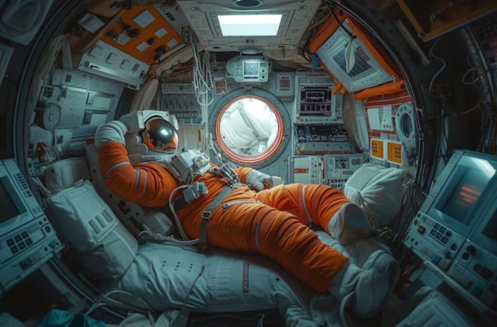 Dormir também é uma experiência diferente. Na Terra, nosso corpo se acomoda naturalmente em um colchão, guiado pelo peso. No espaço, como não há para onde “cair”, os astronautas dormem presos em sacos de dormir que ficam fixados nas paredes ou tetos da estação. Eles podem escolher qualquer orientação — de cabeça para baixo ou para cima — já que não existe “alto” ou “baixo”. O importante é prender-se bem para evitar flutuar durante o sono.